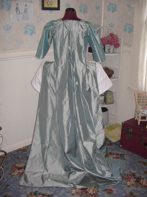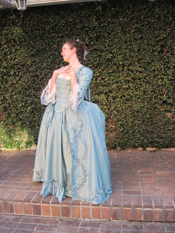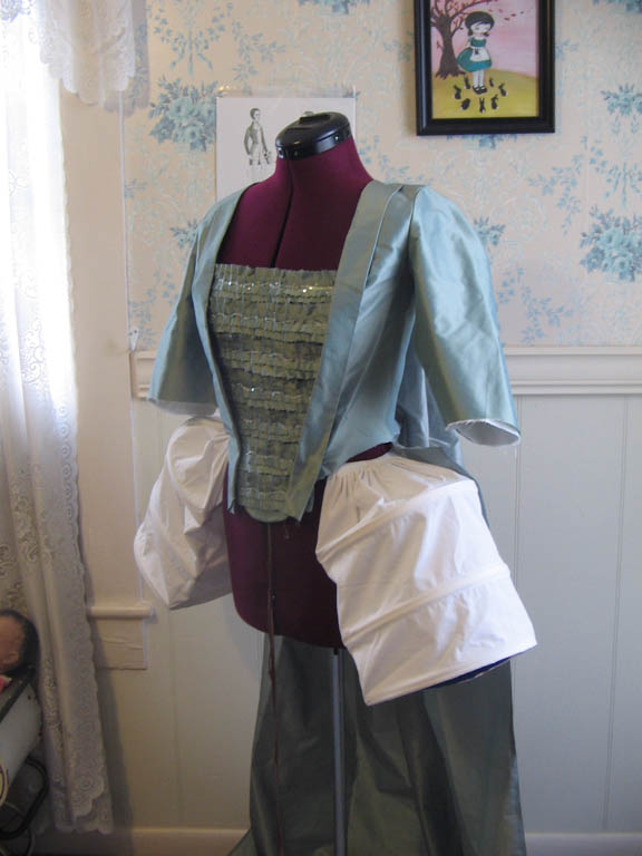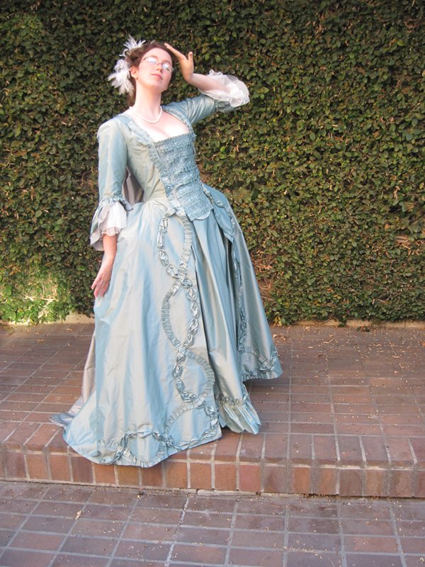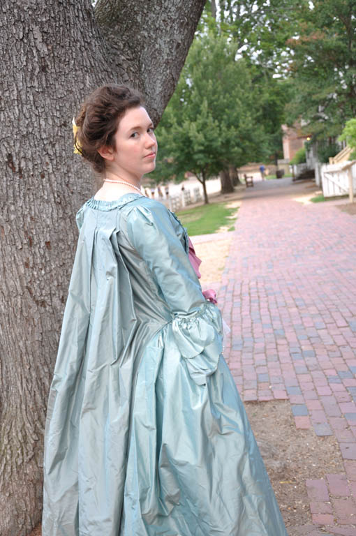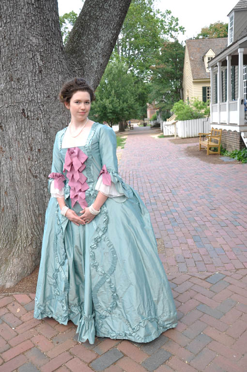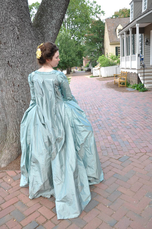 A 1770s robe a la francaise, hand sewn from aqua silk taffeta.
