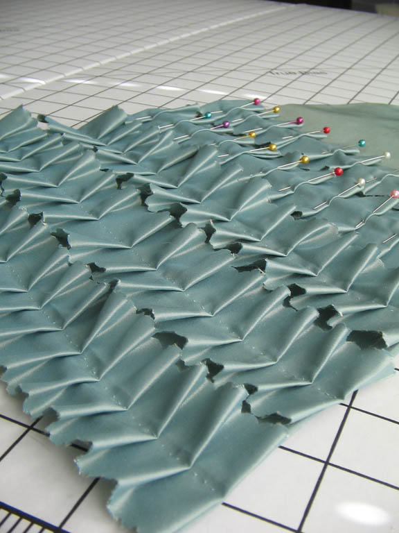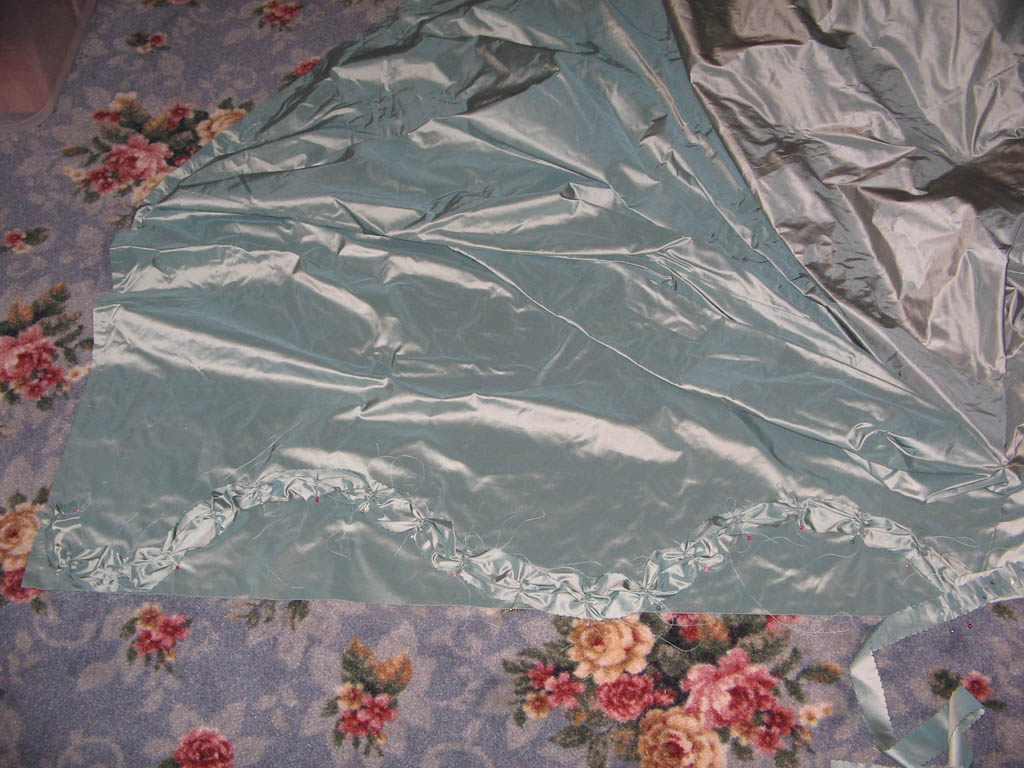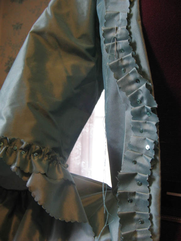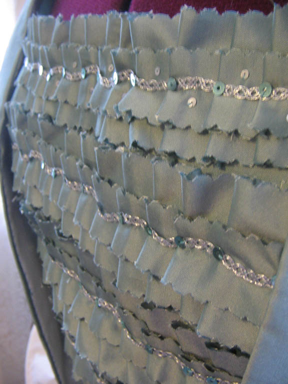 I made two stomachers for this dress. The first is decorated with two layers of scalloped pleated self-fabric trim, one 2 inches wide and the other 1 inch wide. I topped the pleats with some silver braid trim from JoAnns of all places, matching blue-green sequins, and real silver spangles. I wore this stomacher to Costume Con 2009, Costume College 2010, a dinner at Colonial Williamsburg in 2011, and Costume Con 2011.