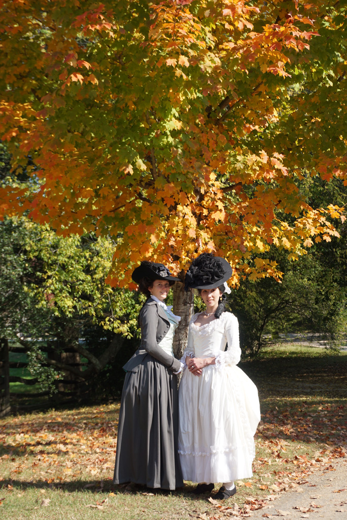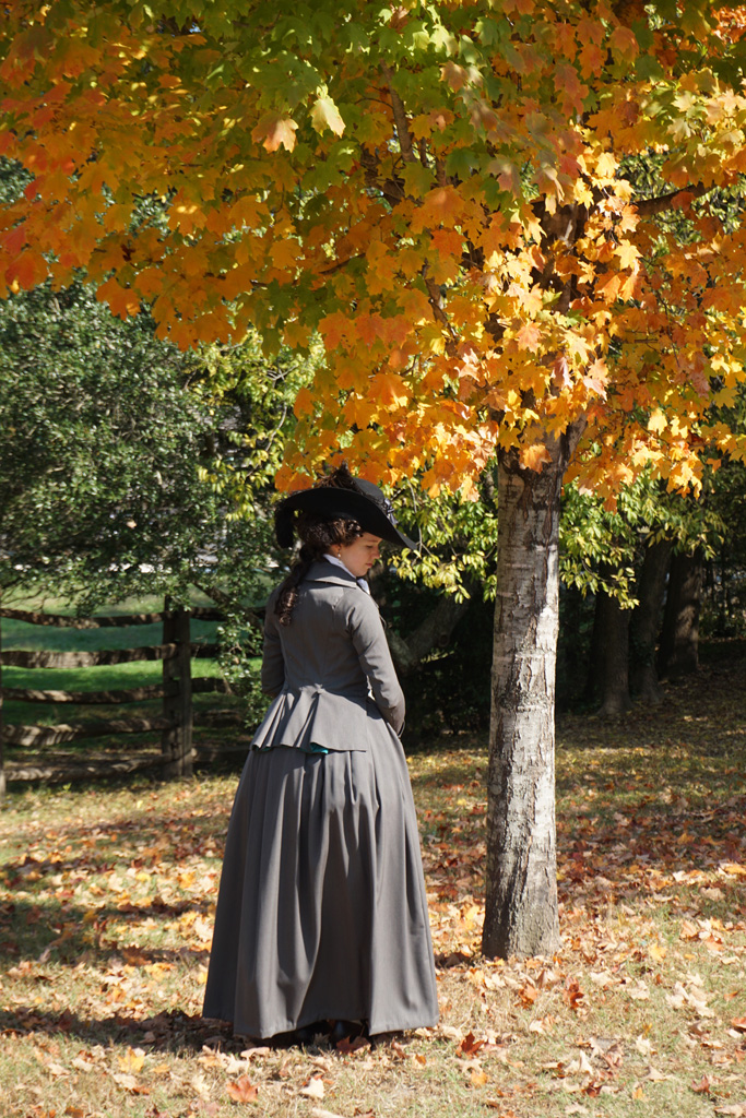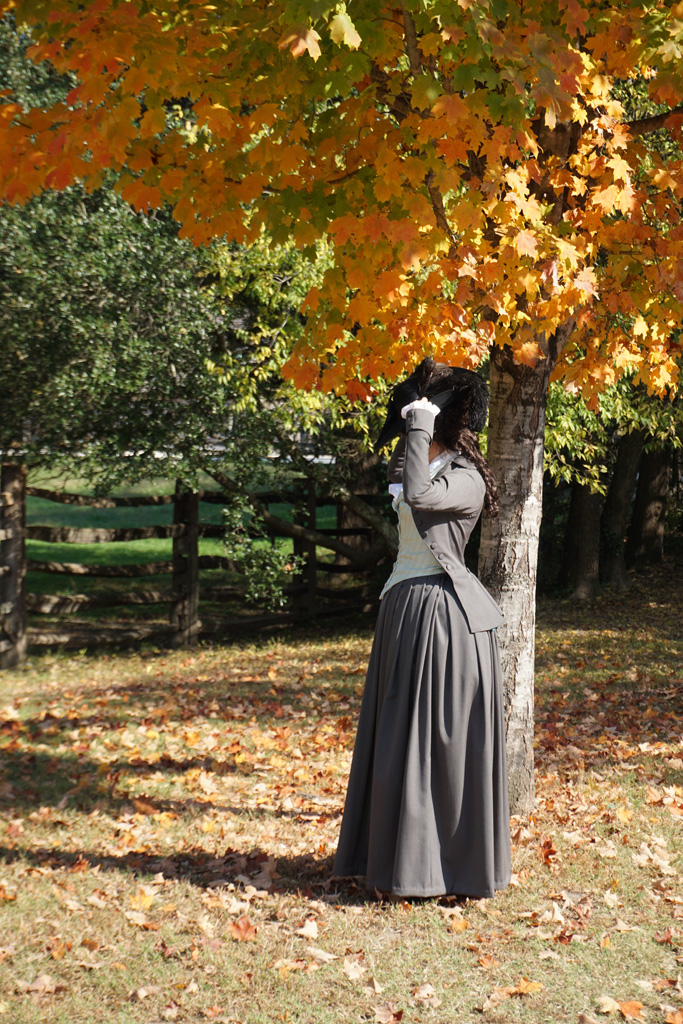 When I was trying to decide what to wear to Colonial Williamsburg last fall, I couldn’t get the idea of a riding habit out of my head. I’ve always envisioned wearing a habit surrounded by gorgeous fall foliage, and I figured this was the perfect opportunity. My blue-green habit no longer fits very well, so I decided to pick up my long-abandoned pink and grey habit project. I already had the shirt from my first habit, the grey wool petticoat and pink silk waistcoat assembled, and a pattern for the jacket started. Of course, once I tried everything on again, I quickly realized the pattern I made three years ago would not work and the waistcoat needed completely remade. So much for a quick project! Thankfully, I loved the way my aqua striped waistcoat looked with the grey wool, so I could focus patterning and constructing a new jacket to go with them.