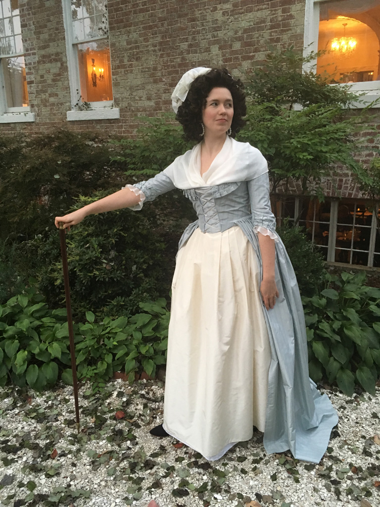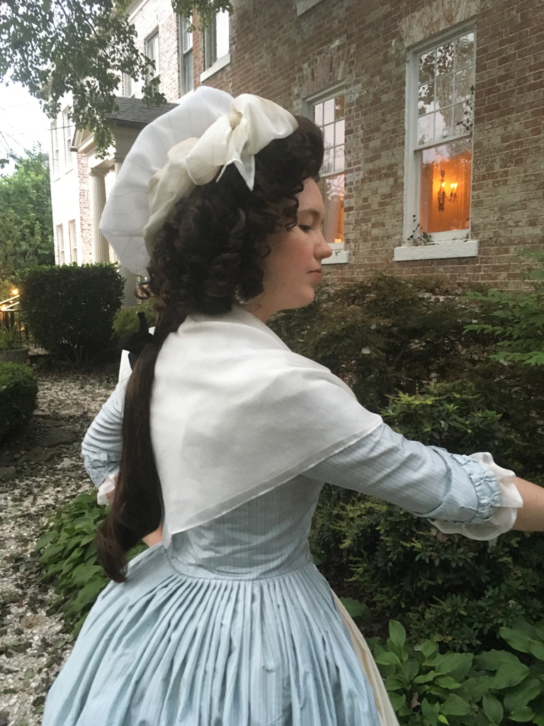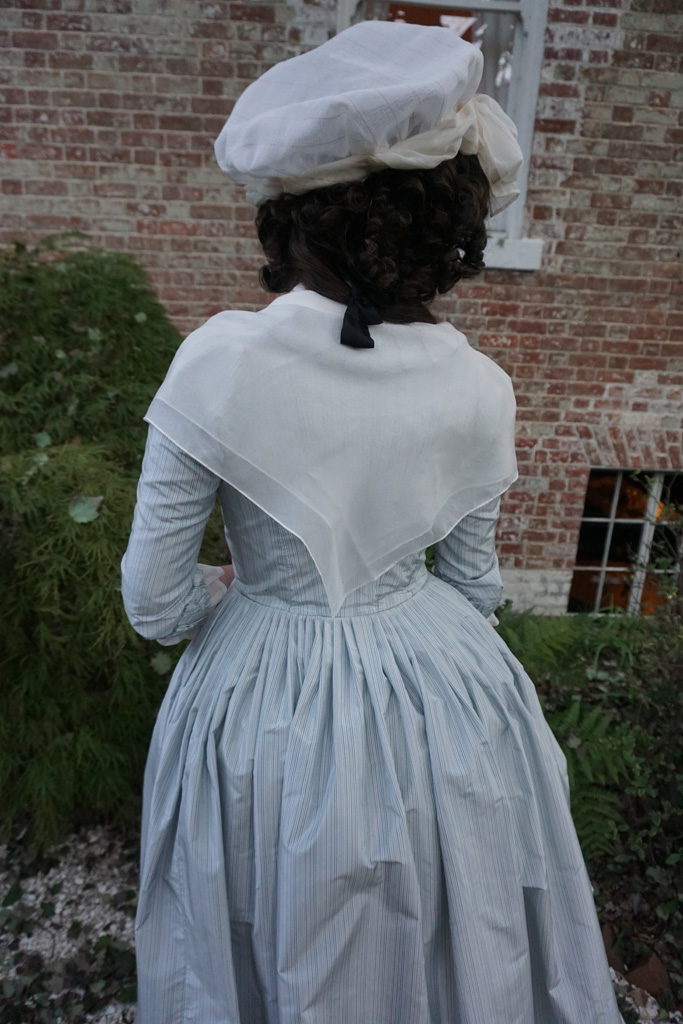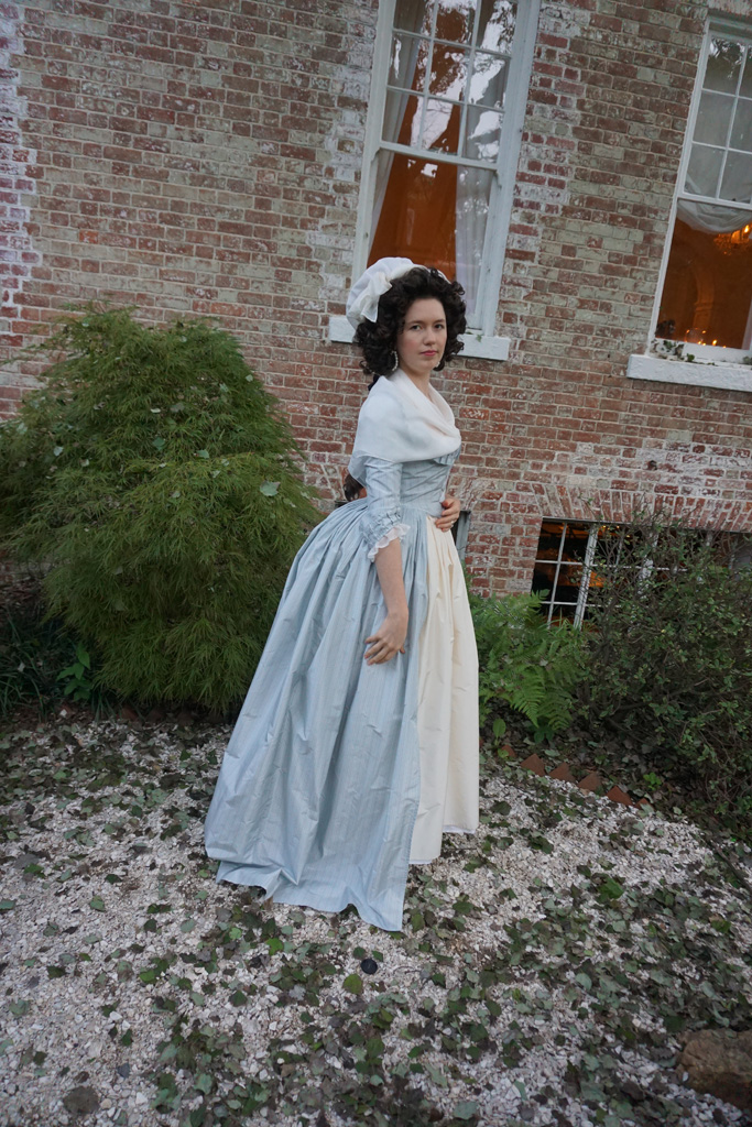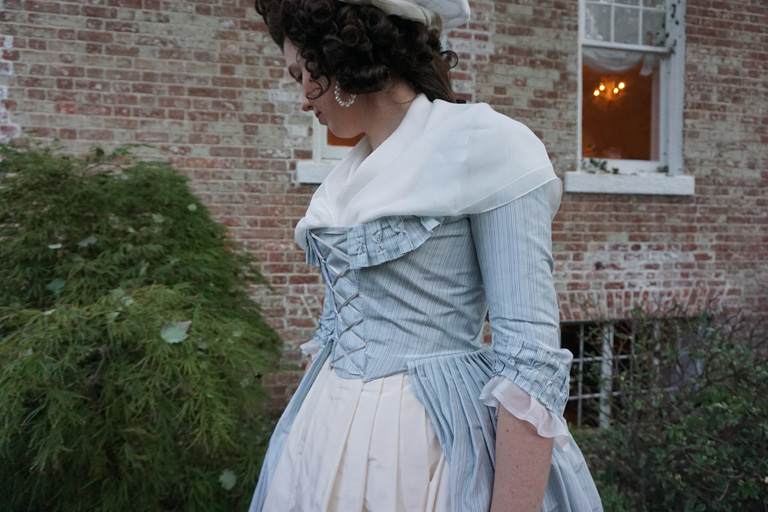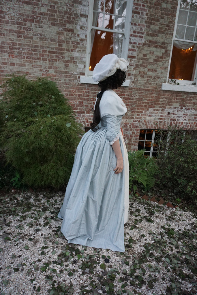 I’m no stranger to altering my costumes. Often after a first wearing there are fitting tweaks I want to make, but I’ve also retrimmed gowns, or completely remade them in the past, or even cut up old dresses to reuse the fabric for an entirely different project. However, with this project I tried something I’ve been thinking about for years. I updated an existing 18th century gown to reflect the new fashionable 1790s silhouette, copying specific alterations I’ve seen on extant gowns. In this case, I took my mid-1780s blue stripe gown which no longer fit, and altered it to a 1790–4 shape.