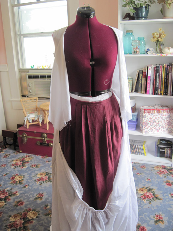 Costume in Detail. The back of the bodice is fitted with a gathered skirt attached and the front skirt is pinned under the front, like a round gown.