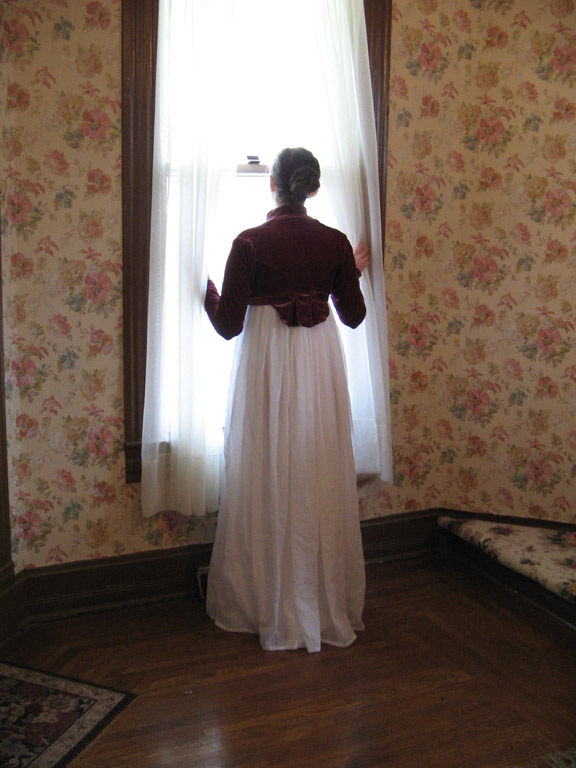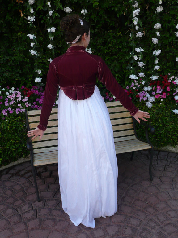 The spencer, slightly later in date, is made from plum colored silk velvet, interlined in cotton, and lined in caramel china silk. The spencer was sewn entirely by hand and the edges were finished with self-piping. It has a standing collar and is ment to be worn open in front, closing with a belt under the bust. It has integrated tails in back and two covered buttons for decoration. The belt and button detail was inspired by a spencer in