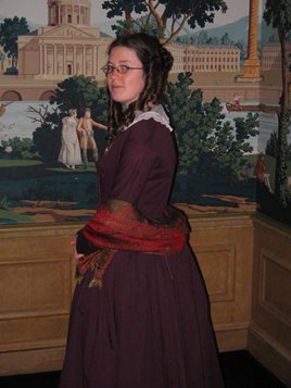 Jane Eyre and this outfit was based on what I thought Jane would wear after her marriage - something simple and plain, yet interesting. Though the novel is set much earlier, I was inspired by a fashion plate from 1847, which seemed appropriate since it was the year the book was published. The gown is made from a plum cotton twill (I would have rather used silk but this was all I could afford at the time), and I accessorized it with a vintage lace collar, antique brooch, and shawl.