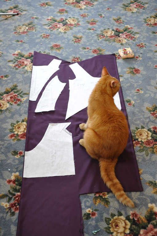 Period Costume for Stage and Screen, page 89-90. I love the little pointed, pleated tails. The back tails are cut in one semi-circular piece that attaches at the waist. Because the lining would have shown with the pleats, I lineed the tails in more spotty fabric.