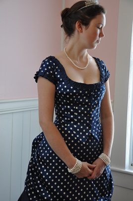I used spotted silk charmuese for the main part of the bodice and trimmed the neckline and sleeves in plain blue taffeta. The bodice has little cap sleeves and closes in the front with self fabric covered buttons.