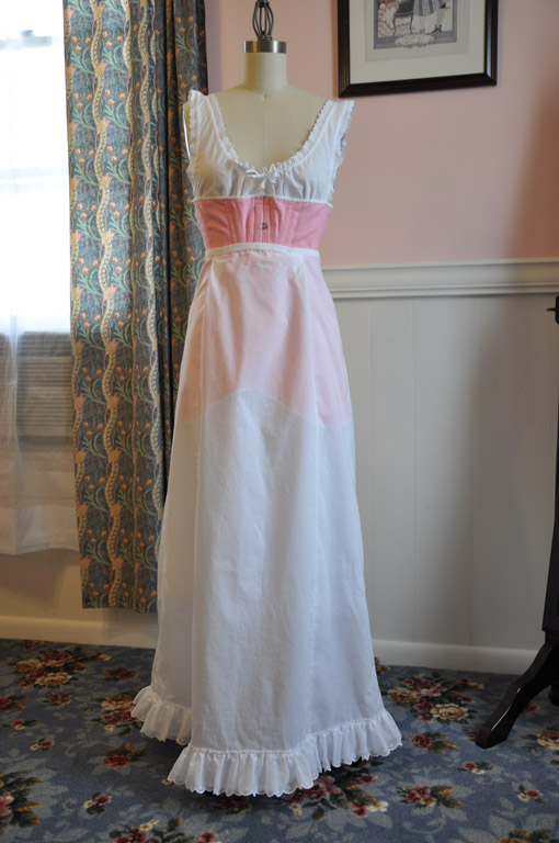 The chemise is made of cotton lawn and trimmed with a cotton broiderie anglaise, and is machine sewn with hand-finishing. I used French seams to finish the sides.