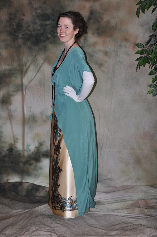 A circa 1912 dinner dress made from teal silk crepe and printed silk charmeuse.