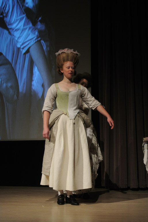 th century dress making on a live model. Sarah took us through the first step of cutting out or draping the lining, while Janea explained the other two steps – fitting and making up. The pattern was draped directly on the client, the fashion fabric was cut out using this pattern, and the dress constructed.