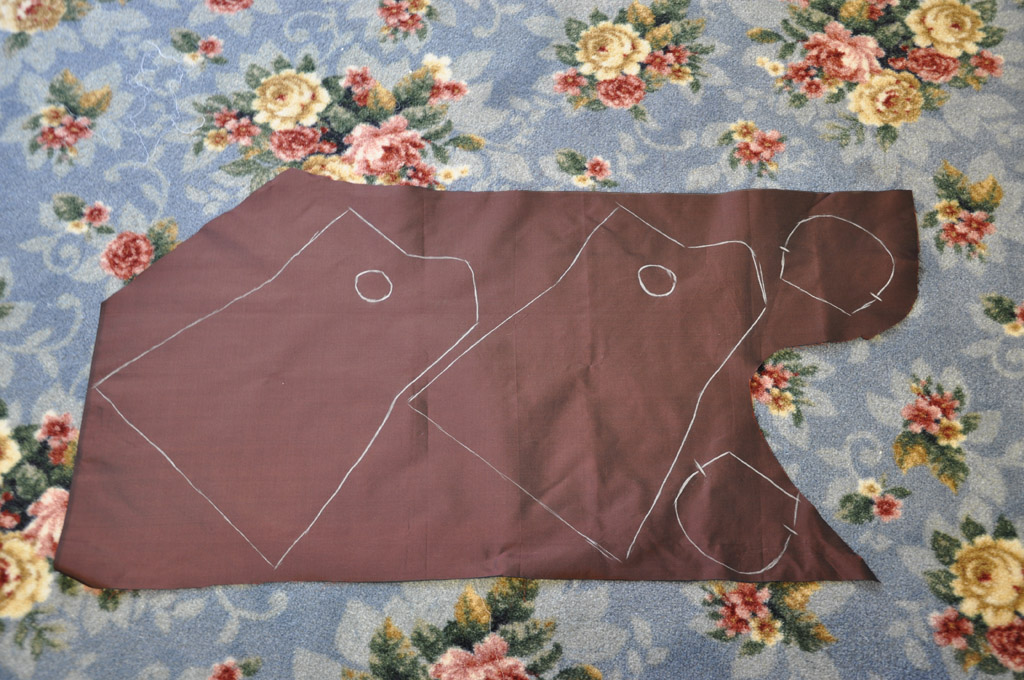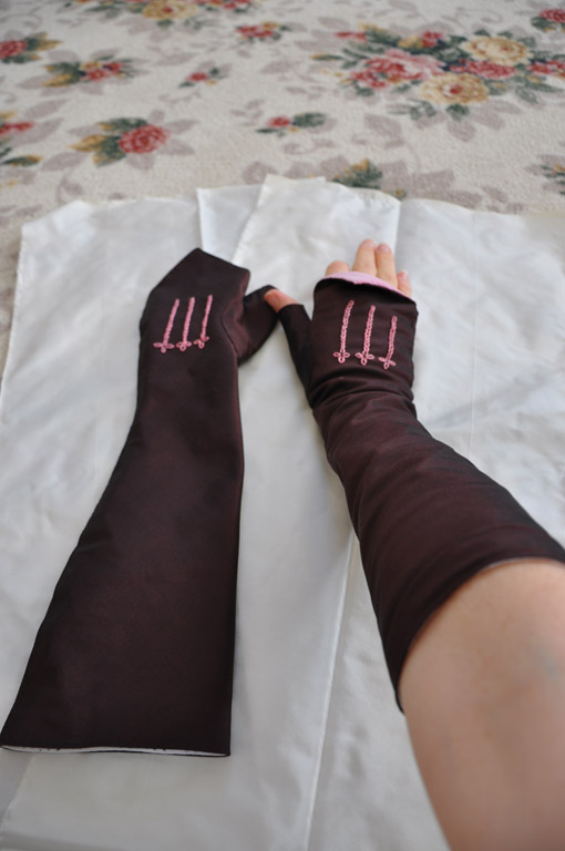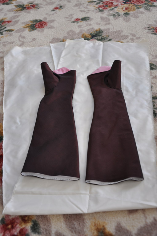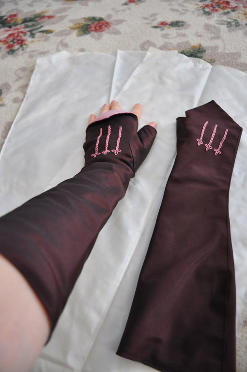 Costume Close-Up and then fit the muslin on my arm. It actually came together much more easlily than I had anticipated. The original mitts are lined in leather, but I'm not a fan of working with leather or having it touch my skin, so I went with a light-weight linen for the lining and a brown/black changeable silk taffeta for the outer fabric.