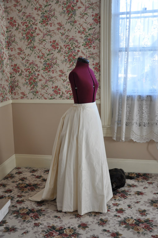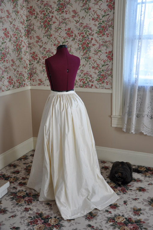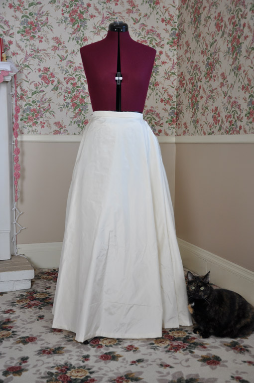 The underskirt is cream silk taffeta, flat lined in cream polished cotton. The seams are sewn on the machine and simply pinked to prevent fraying. The hem is turned up twice and hand sewn with a hemming stitch.