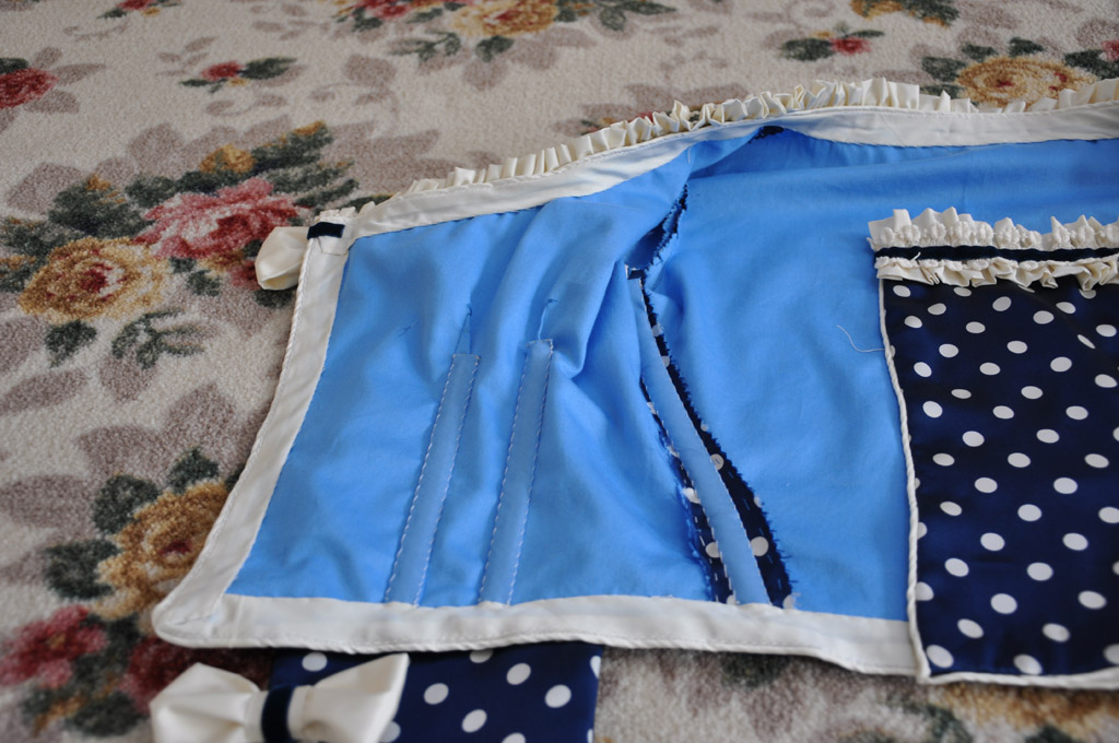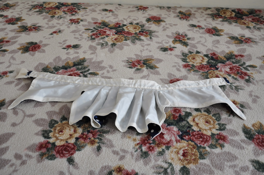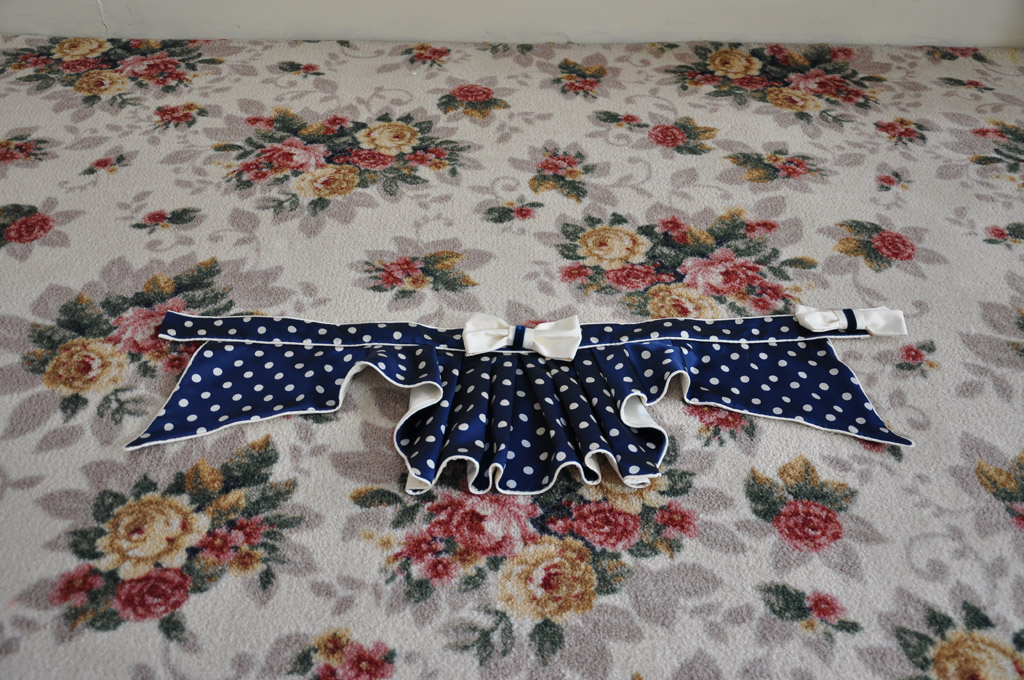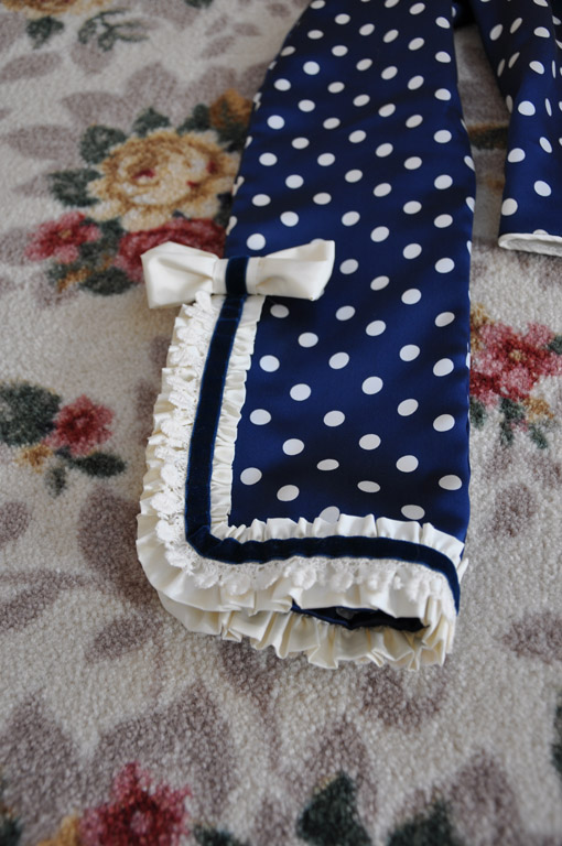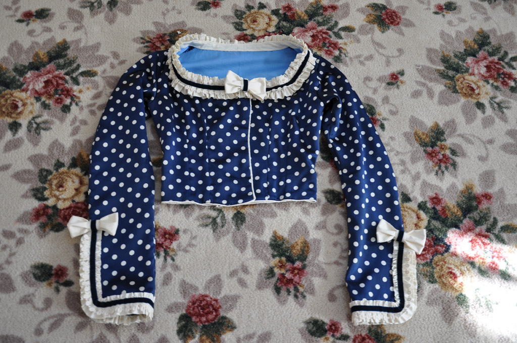 The neckline and sleeves are trimmed with gathered strips of cream silk, layered with vintage cotton lace and navy velvet ribbon. Silk bows with velvet ribbon finish off the neckline, peplum and sleeves. The outer sleeve seam was sewn to just above the wrist, the raw edges were then finished with a narrow hem and the decoration applied.