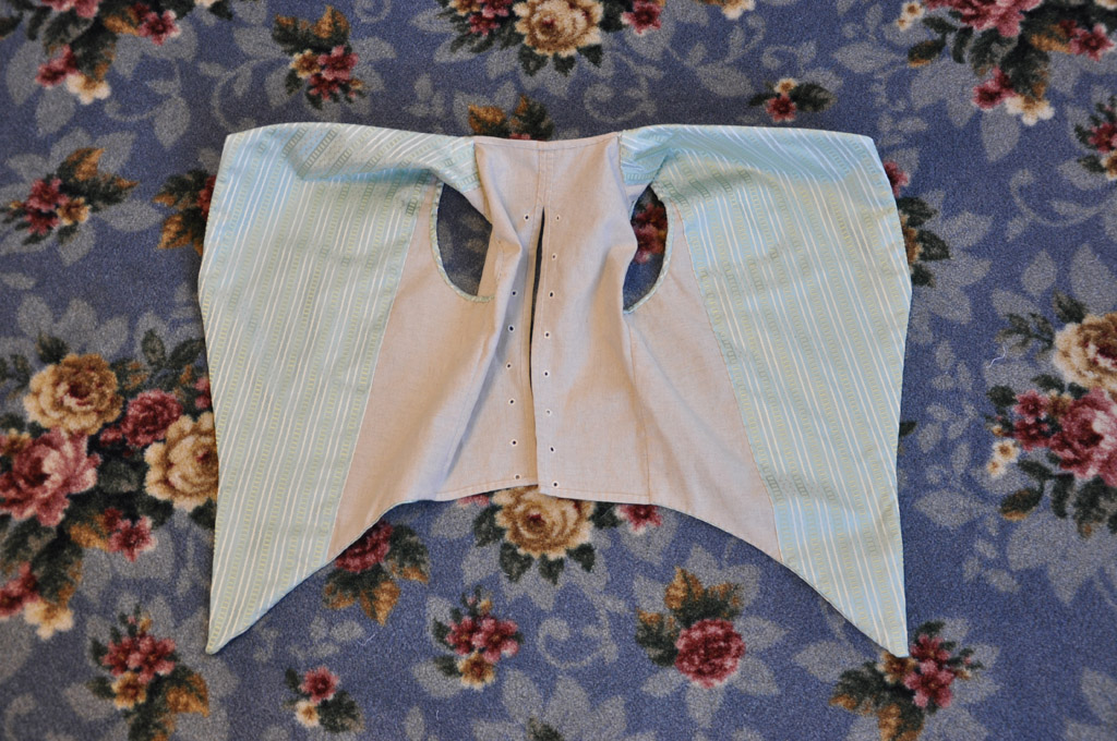 Now it’s on to buttons and buttonholes! Normally I hate buttonholes (they are so permanent!), but the back lacing gives some adjustability, so I’m not terrified that it wont fit in three months. For buttons I’m thinking cream death’s head ones, but I’m still working up the courage to try them. If all else fails, I can always just make fabric covered ones.