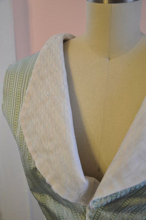 I sewed the waistcoat together on the machine, but all visible stitching was done by hand. The back is one layer of linen, while the fronts are silk flatlined in linen, with an extra strip of linen down the center front for the pad stitching. The fronts are then faced with more striped silk.