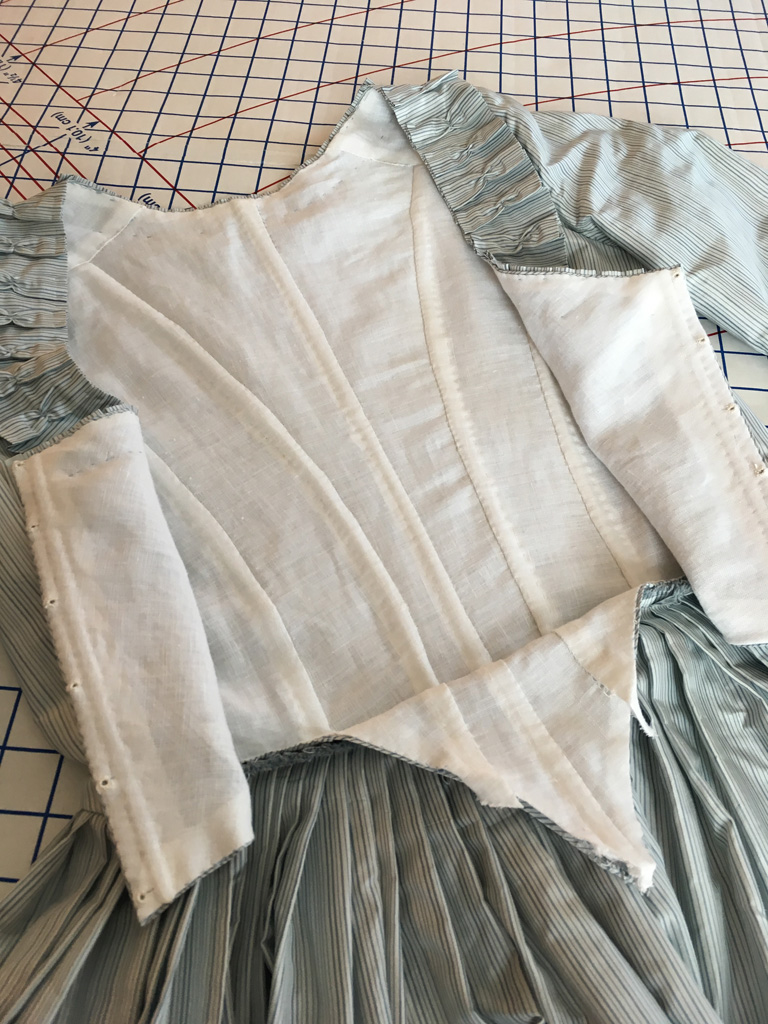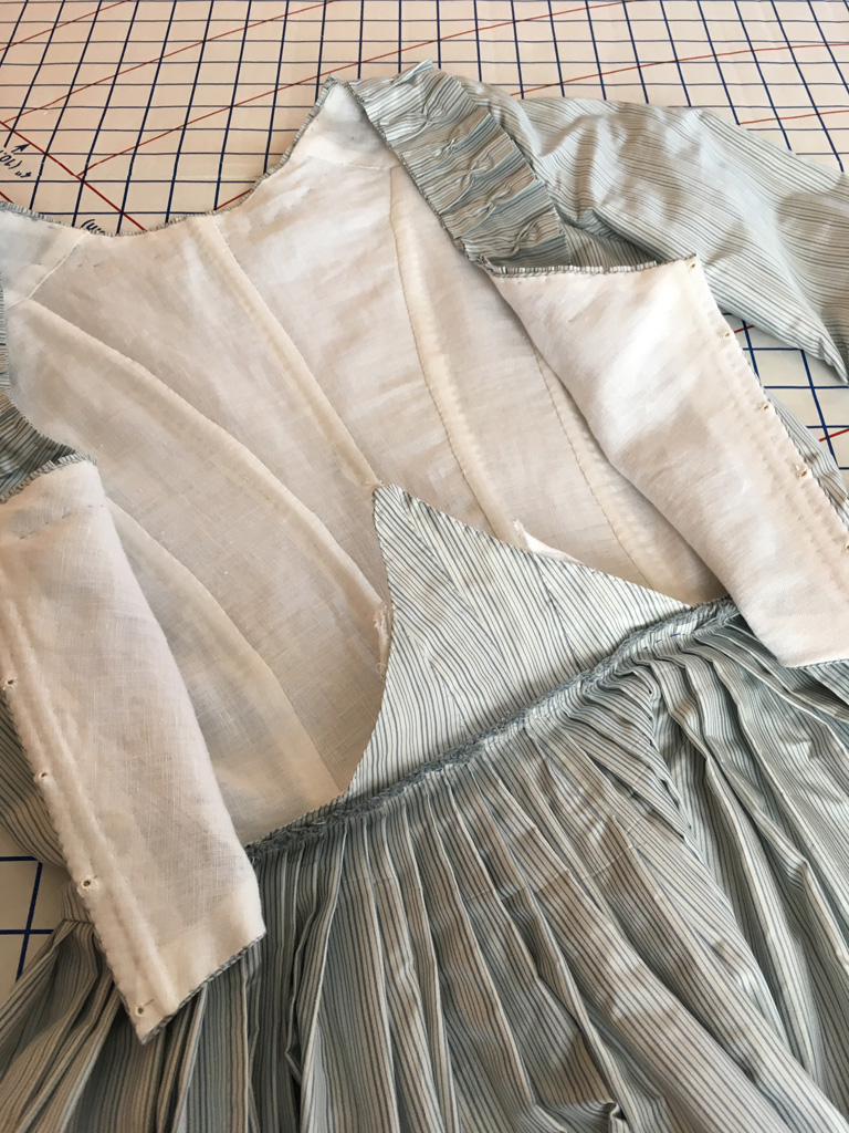 Once I had the bodice altered, I re-pleated the skirt panels and mounted them just above the finished edge of the bodice. The original back point was left intact and free on the inside of the skirt. When I was in England a couple of years ago, I was lucky enough to examine two dresses at the Fashion Museum in Bath that were altered in this same way. Unfortunately, I can’t share photos from the study session, but it’s one of the things that sparked my inspiration for this project. The little back flippy-flappy, as I like to call the old back bodice point, is one of my favorite details. I love how multiple seamstresses couldn’t be bothered to finish the edge, or as Carolyn of