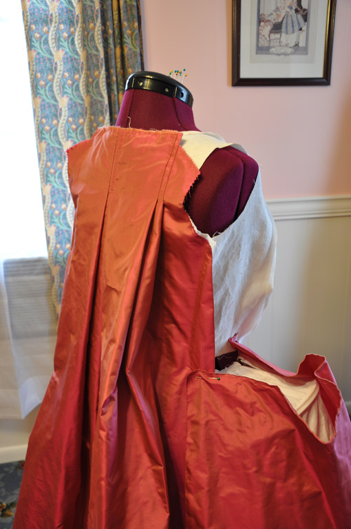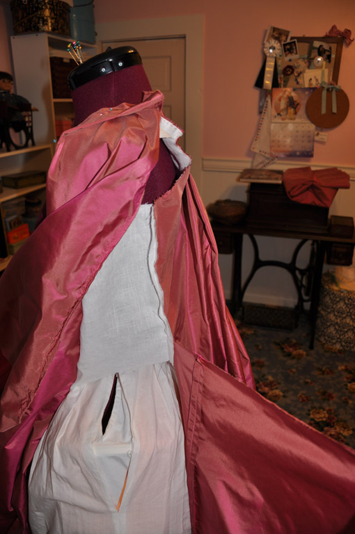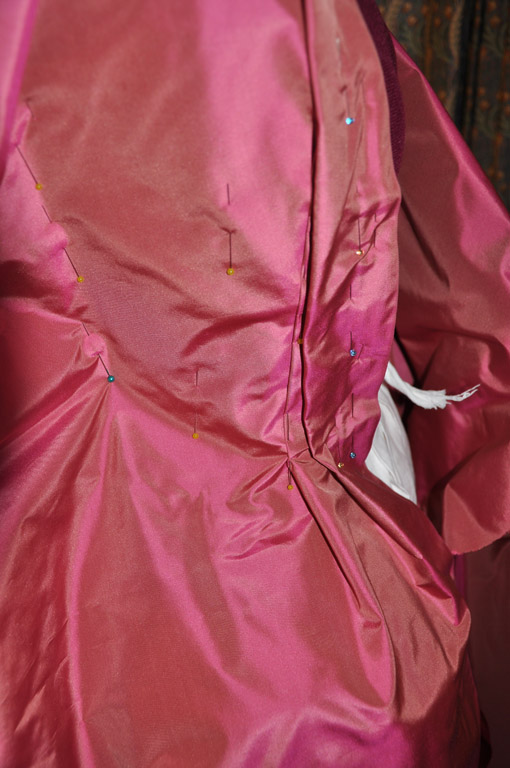 Each front piece is one half width of taffeta. I used the selvage for the robing and skirt edges and pleated the robings on to the lining at the shoulders first. The robings are a 2.5 inch knife pleat. After the shoulders, I continued the pleat down the front of the lining, leaving a ¼ inch over hang, which I turned under later. I then pinned a dart from bust to waist, hiding it under the robing. The excess fabric was smoothed to the side seam and the arm holes and shoulder seams were trimmed to match the lining. I tried on the dress to check the fit of the dart and adjusted the side seam as necessary. The excess fabric was trimmed from the side seam to one inch above the waist, like the back pieces, and the full width of fabric was left for the side skirt.