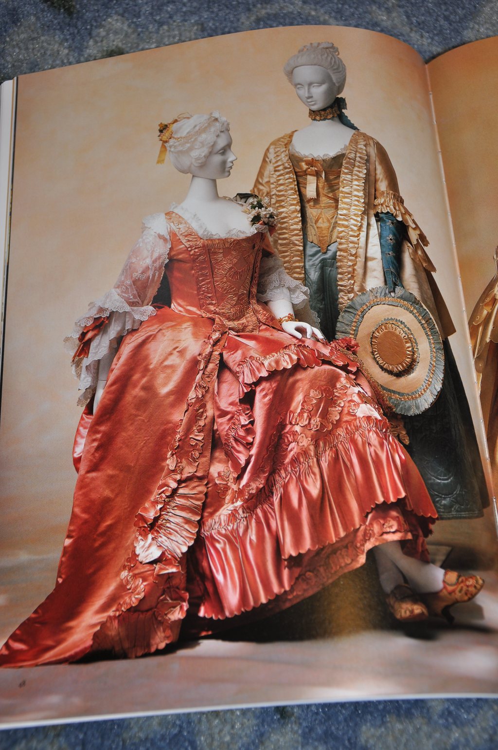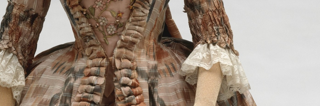 The Cut of Women’s Clothes. Instead of a separate waist seam it has a vertical dart that runs from bust to waist, easing the bodice fabric into the skirt. However, the diagram is dated 1740-50, much earlier than my target of 1760-65. By the 1760s most dresses were being cut with a separate waist seam at the front. I did this with my aqua Française and while I like the look, I really wanted to try a new type of construction. I’m more attracted to the later trimming style though. A search through my costume library confirmed the idea that most of the 1760s were cut with a waist seam, however, I found two dresses from the MET that have the vertical dart and they are dated much late. That’s good enough for me!