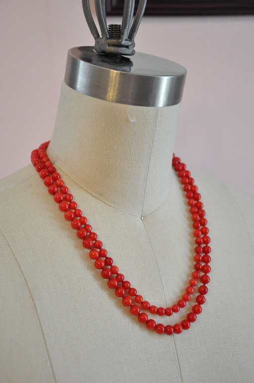 First I made a double strand of the traditional red coral. I love the bright pop of color it gives, and can see myself wearing this with modern clothes. Each strand is hand knotted and it closes in back with a silver box clasp.