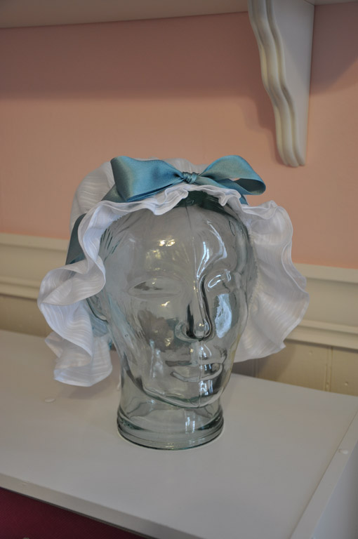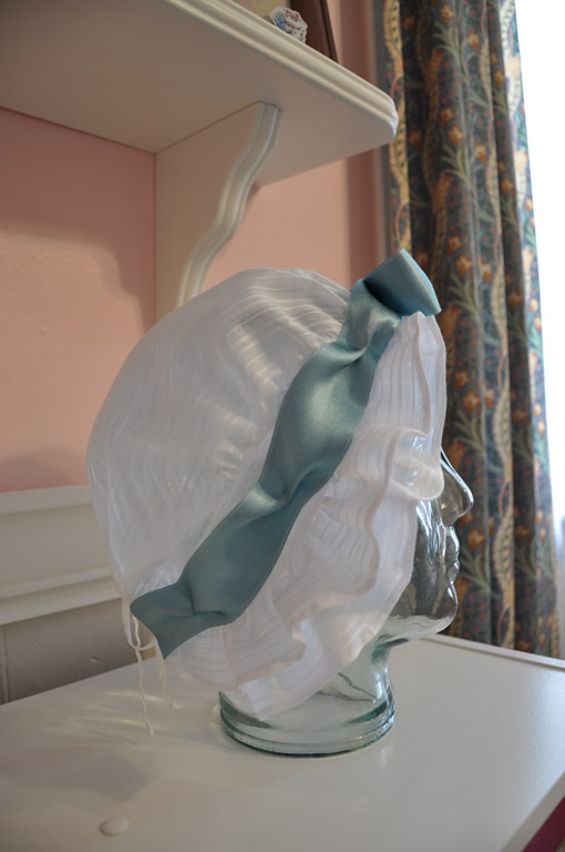 The cap is made from a striped sheer cotton organdy and trimmed with a silk satin ribbon. Since I wasn't striving for 100% accuarcy, most of the cap is machine sewn. I even finished the seams with a zigzag stitch. (Shhhh! Bad!) I did hem the ruffles and the drawstring channel by hand.