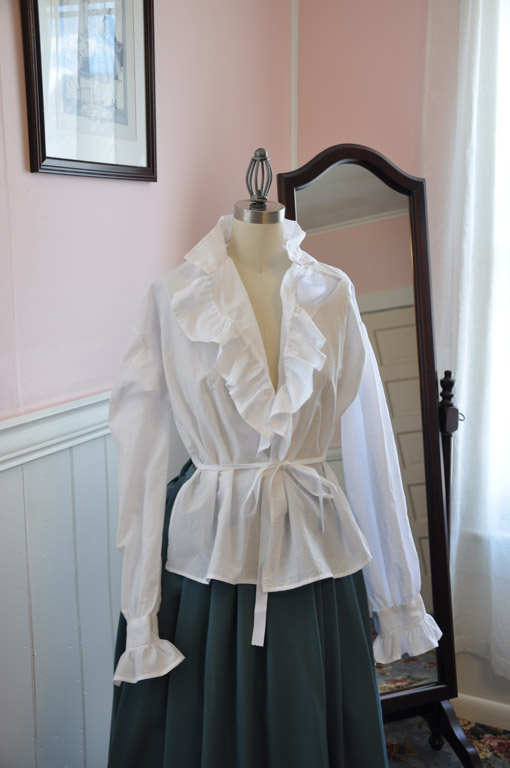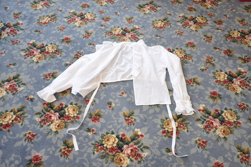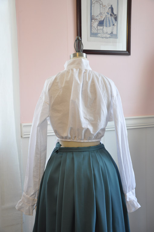 The shirt was constructed on the machine but all the seams were felled by hand and the rest of the shirt was also finished by hand. The neckline and cuff ruffles were gathered and attached using whipgathers. The shirt is open at the front and only closes with a button at the neckline. The back is gathered to a tape which ties in front, not only keeping the shirt closed but it helps keep the tails from riding up when you are wearing it.