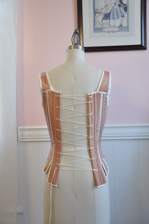 After the boning was inserted and the eyelets on the back were worked, I tried on my stays to check the fit before moving on to binding. I am incredibly glad I did! It was too big! In fact I could lace the stays completely closed. Otherwise, the shape on my body was great, so I ripped out the lining and boning, and took the stays in at the center front and at the two back seams. I left the center back alone, since certainly didn’t want to have to redo all those eyelets! To finish, I added decorative ivory silk ribbon along the seam lines and bound the stays in ivory cotton (since it was all I had on hand).