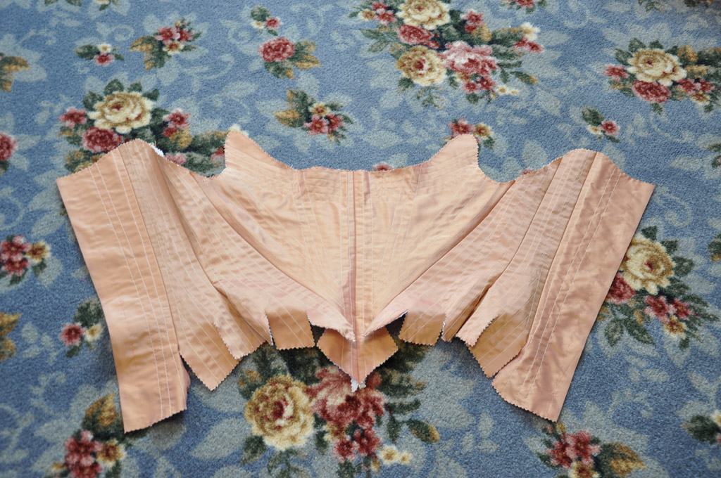 Construction was fairly straightforward. To start I traced the pattern pieces to a layer of heavy linen, and then basted that to a layer of silk taffeta, leaving lots of excess seam allowance. The visible boning channels were sewn on the machine in cream silk thread. This process was incredibly tedious since I wanted the channels to be as straight as possible and I didn’t want any unsightly backstitching on the front the corset. To finish the stitching on each channel, I pulled the thread through the front and secured it on the back of the piece. The pattern pieces were then cut out and assembled. I’m not sure I would want to repeat this process on another corset, my perfectionist tendencies are too strong, but it was interesting to make a half-boned pair of stays with visible stitching.