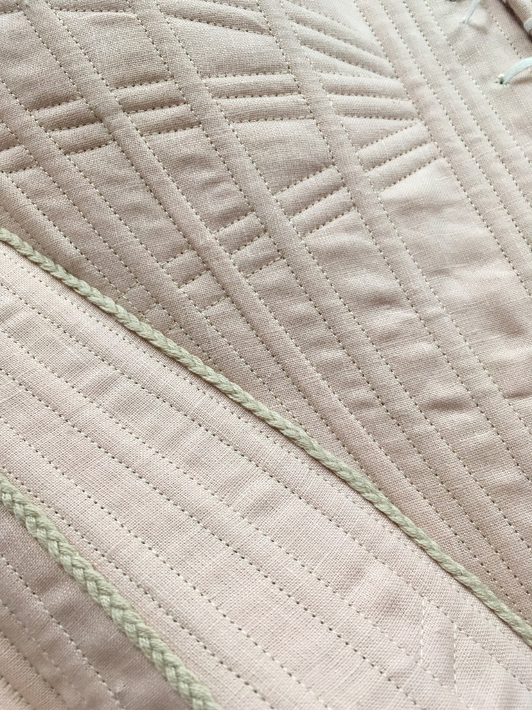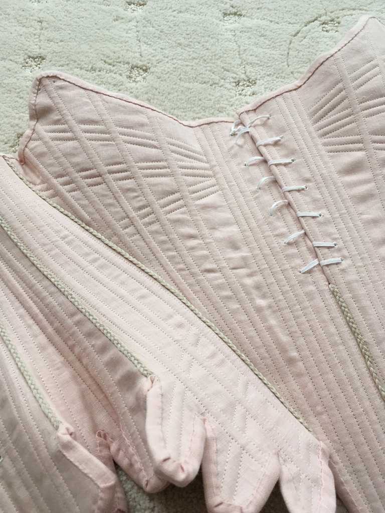 The stays are made from two layers of linen buckram for the inner structure and a layer of pale pink linen as the outer fabric, and is mostly machine sewn. The boning channels were stitched on each piece individually, and then the stays were assembled.