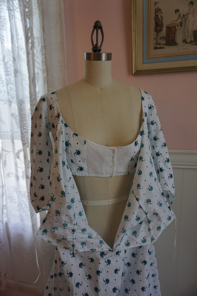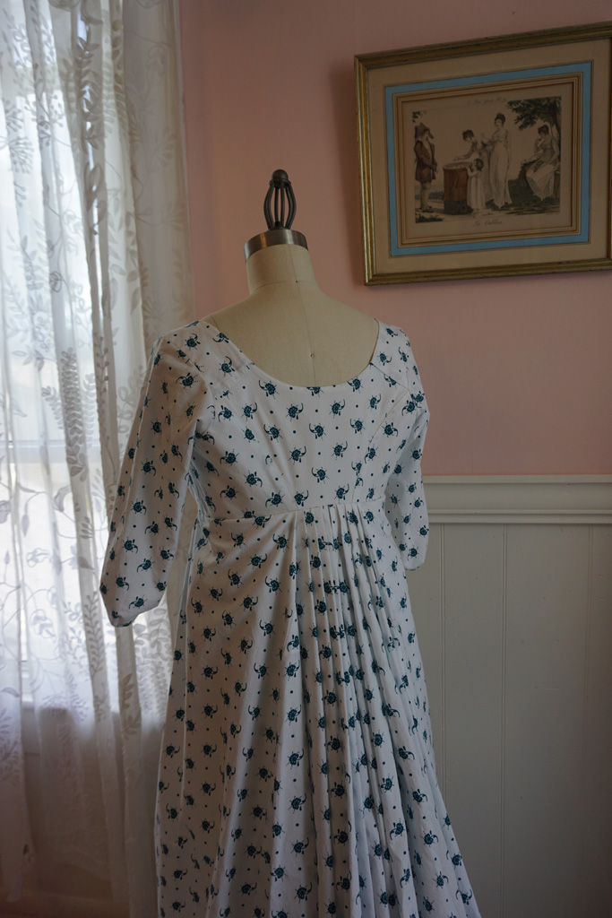 I wanted a new comfy (and more importantly cool) dress to wear at the Jane Austen Festival this year. Since I was behind on my sewing schedule I decided to stick with what I know and love and made yet another late 1790s gathered front dress. Honestly, I don’t get tired of these. The style is so easy to wear and the gathers mean the sizing is very forgiving. And with a busy small scale print, it means I can worry less about the inevitable dirt and stains that come with picnicking at an outdoor event.