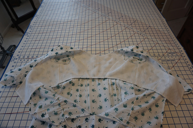 The dress is made from a lovely two-tone indigo print from Burnley & Trowbridge and is sewn with a combination of machine and hand stitching. The construction follows the same method as my blue striped gown,